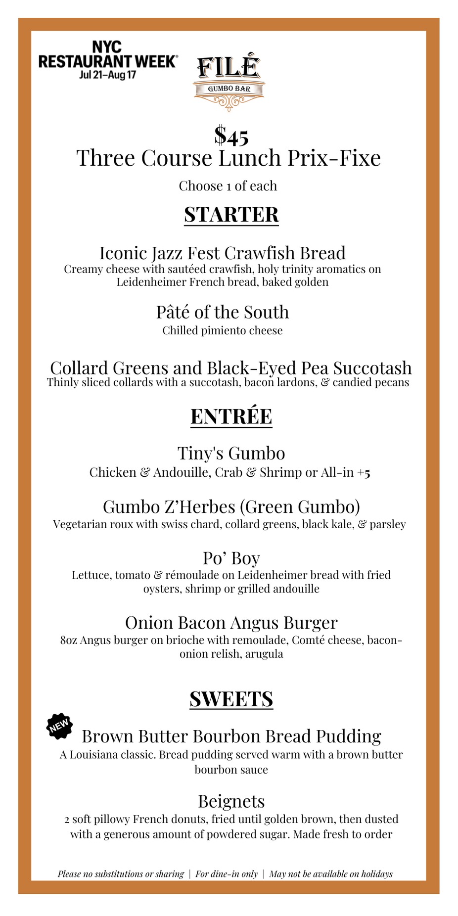 We will have our dinner 3-course prix-fixe available for $60 and lunch for $45